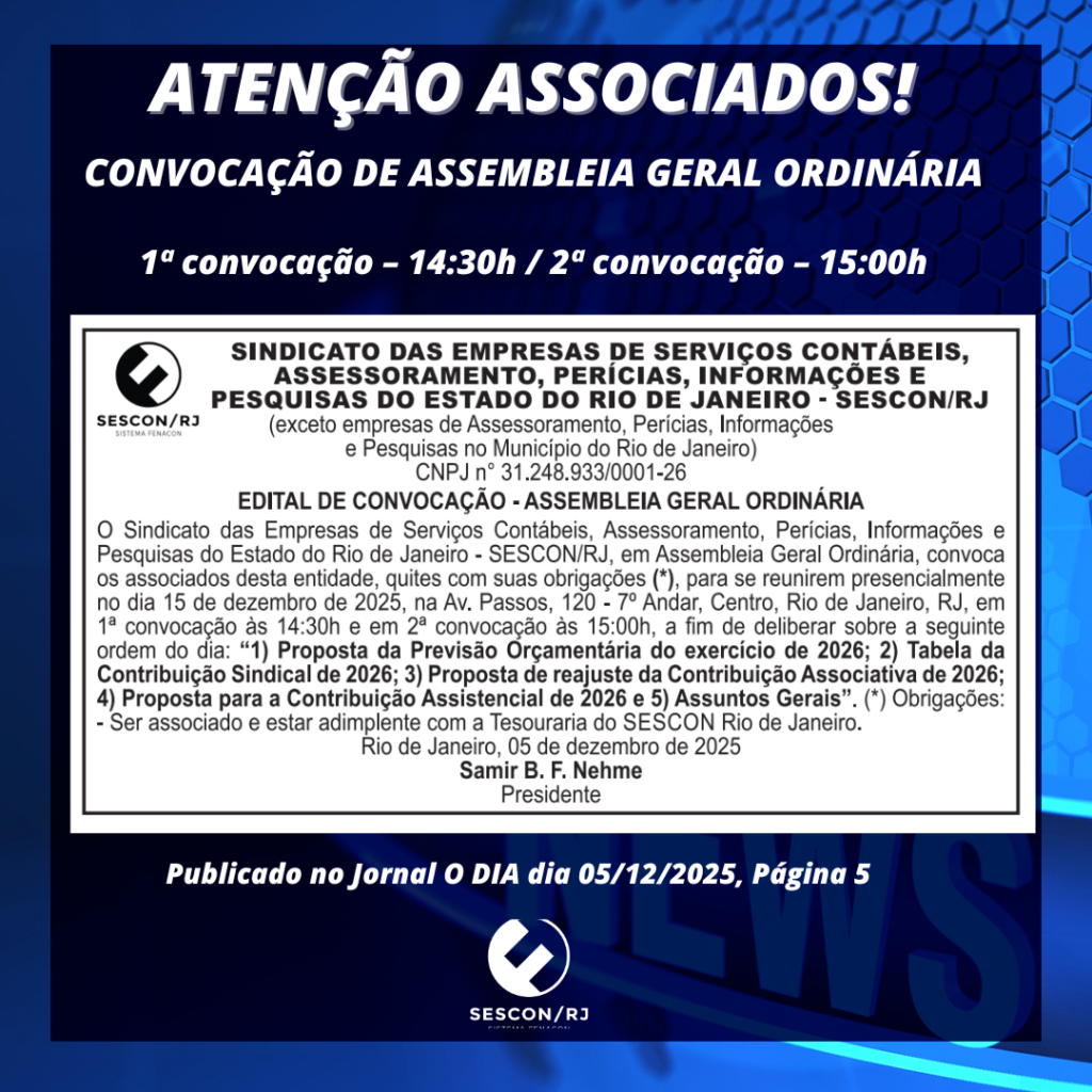 SINDICATO DAS EMPRESAS DE SERVIÇOS CONTÁBEIS, ASSESSORAMENTO, PERÍCIAS, INFORMAÇÕES E PESQUISAS DO ESTADO DO RIO DE JANEIRO(exceto empresas de Assessoramento, Perícias, Informações e Pesquisas no Município do Rio de Janeiro)CNPJ: 31.248.933/0001-26 EDITAL DE CONVOCAÇÃO – ASSEMBLEIA GERAL ORDINÁRIA O Sindicato das Empresas de Serviços Contábeis, Assessoramento, Perícias, Informações e Pesquisas do Estado do Rio de […]