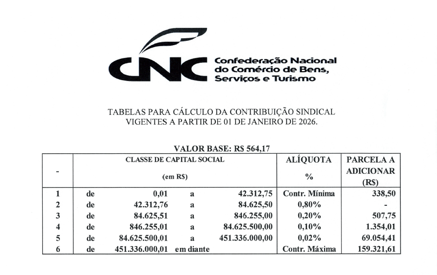 Você pode conferir a tabela disponibilizada através do site da CNC, com os valores base de 2026, clicando aqui.